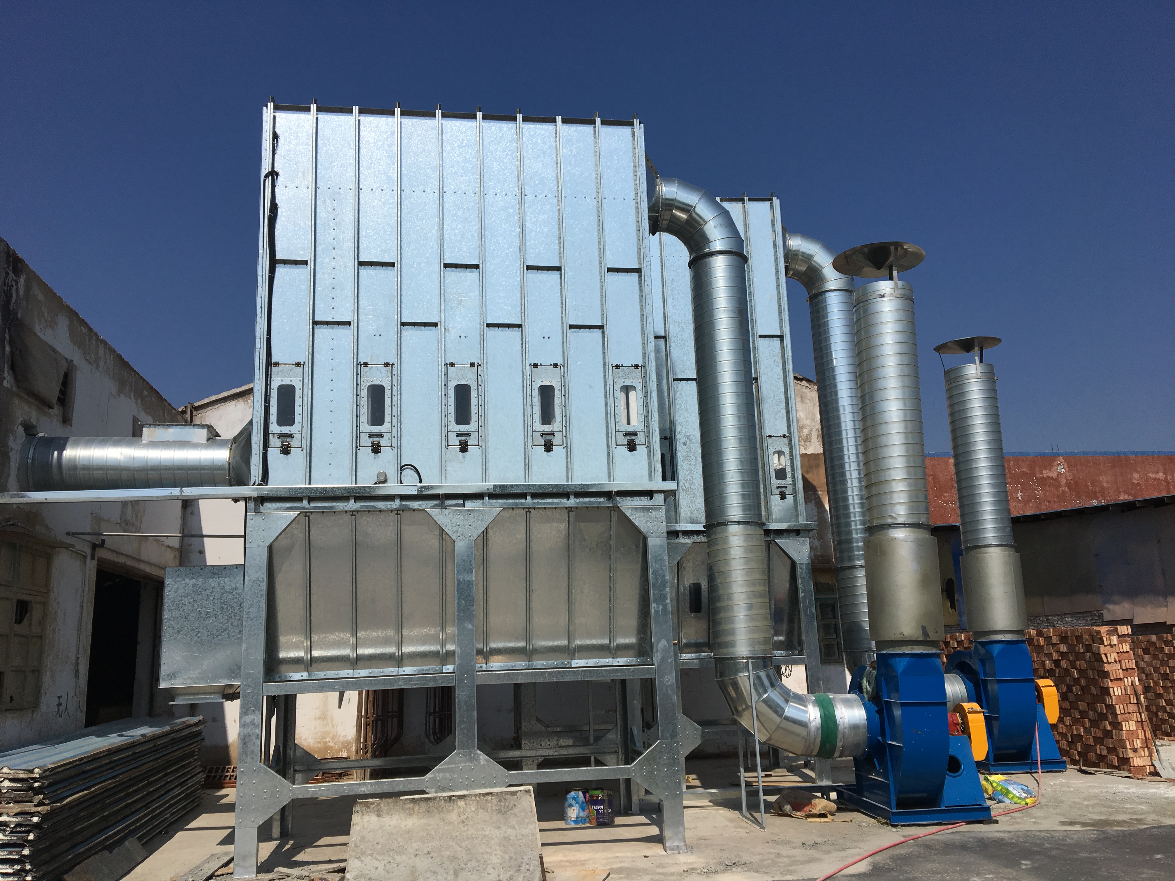 8、本除塵器可室外露天設(shè)置,不用建造除塵器間;同時(shí),除塵器采用標(biāo)準(zhǔn)模塊組合箱體式結(jié)構(gòu),可根據(jù)用戶需要方便地增加尺寸、擴(kuò)大處理風(fēng)量、變換配套風(fēng)機(jī),適合企業(yè)不斷發(fā)展變化的需要。如果在北方還可(經(jīng)布袋除塵后的空氣可返回車間,做到排塵不排熱,又可減少車間空氣濕度變化。管道設(shè)有二次濾塵裝置,并設(shè)有轉(zhuǎn)換閥,滿足夏季和冬季不同要求。)