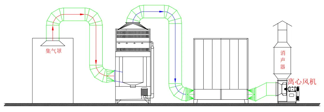 當生產作業時,煙塵廢氣在風機牽引力的作用下進入高速混流導軌裝置,煙塵廢氣在離心力的作用下進行氣液乳化反應,在混流液的高速旋轉狀態下,污染物與旋轉液體充分混合吸收相溶增加煙塵比重,利用旋流裝置設計好的離心力達到氣液分離,分離后的氣體進入環保填料吸附層,螺旋噴頭噴出的對應溶劑均勻分布在填料上,由于填料的合理設計,污染物浸透在填料的時間較長,與反應液在專用環保填料表面有充分的氣液相溶反應時間,從而達到達標排放的目的。