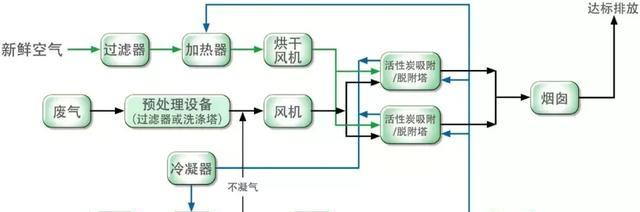 先將有機(jī)廢氣用活性炭吸附,當(dāng)快達(dá)到飽和時(shí)停止吸附,然后用熱氣流將有機(jī)物從活性炭上脫附下來使活性炭再生;脫附下來的有機(jī)物已被濃縮(濃度較原來提高幾十倍)并送往催化燃燒室催化燃燒成二氧化碳及水蒸氣排出。當(dāng)有機(jī)廢氣的濃度達(dá)到2000PPm以上時(shí),有機(jī)廢氣在催化床可維持自燃,不用外加熱。燃燒后的尾氣一部分排入大氣,大部分被送往吸附床,用于活性炭再生。這樣可滿足燃燒和吸附所需的熱能,達(dá)到節(jié)能的目的。再生后的可進(jìn)入下次吸附;在脫附時(shí),凈化操作可用另一個(gè)吸附床進(jìn)行,既適合于連續(xù)操作,也適合于間斷操作。