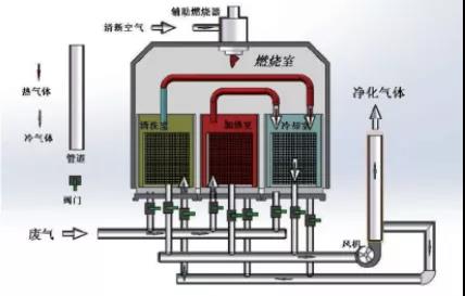 RCO蓄熱式催化燃燒法作用原理是:結合蓄熱式氧化及觸媒氧化,在陶瓷蓄熱體上部填充催化劑,借助催化劑使有機廢氣在相對較低的起燃溫度(280-500℃)下氧化分解成CO2和H2O,氧化產生的高溫氣體流經另一個蓄熱室繼續催化氧化反應放熱,使陶瓷體升溫而“蓄熱”,此蓄熱用于預熱后續進入的有機廢氣。?RCO裝置與RTO裝置相類似,多采用床式設計,蓄熱室底部填充陶瓷蓄熱體,催化劑填充在陶瓷蓄熱體與氧化室之間。